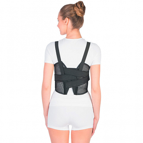 имеет нерастяжимую переднюю панель для надежной фиксации переднебоковых частей грудной клетки и эластичную заднюю часть для сохранения мышечного тонуса