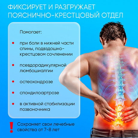 Уменьшает нагрузку и снижает боль в области спины и позвоночника.