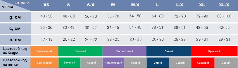 - Цветной квадрат в области пятки представляет собой цветовой код, соответствующий определенному размеру. Цветовая кодировка позволяет сократить время подбора размера трикотажа до нескольких секунд.