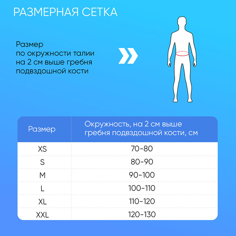 Размер подбирается по окружности на 2 см выше гребня повздошной кости.