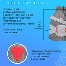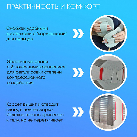 Снабжен 2-мя жёсткими вставками в области «спинки» и 2-мя самоадаптирующимися пластмассовыми шинами в корсетной части, застегивается спереди с помощью прочной износостойкой застежки «велькро» с удобными «кармашками» для пальцев, комплектуется съемным массажным пелотом, закрепляемым в поясничной области.