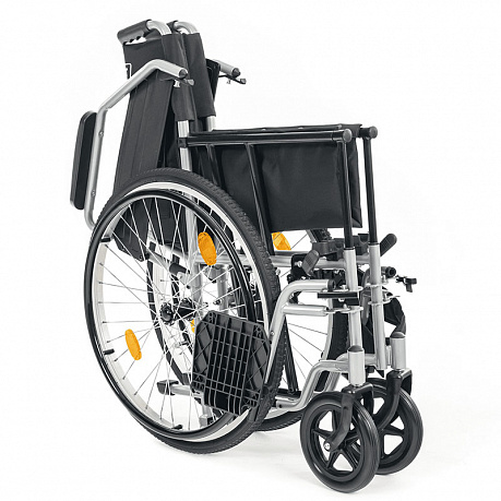 Съемные антиопрокидыватели делают езду в гору безопасной. Коляска снабжена откидными подножками и стояночным тормозом, что делает пересаживание человека из коляски и в неё более безопасным и удобным.